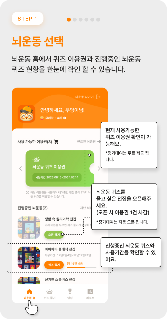 해당 이용권을 사용하여 대여중인 전집 중에 1가지 뇌운동 퀴즈를 이용할 수 있습니다.